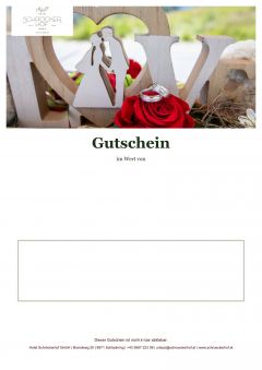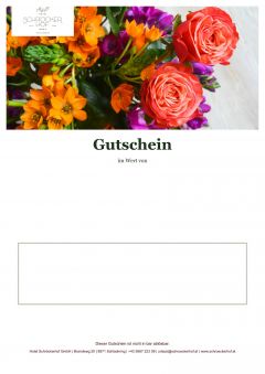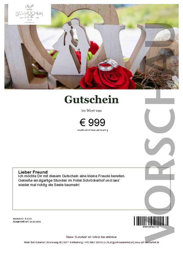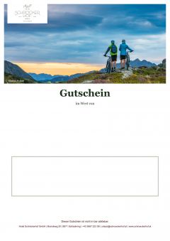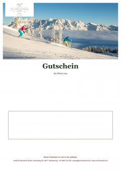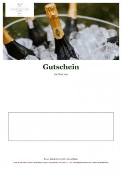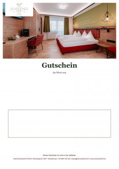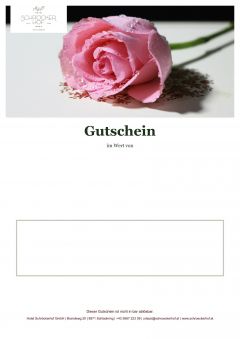 Ich möchte Dir mit diesem Gutschein eine kleine Freude bereiten. Genieße einzigartige Stunden im Hotel Schröckerhof und lass' wieder mal richtig die Seele baumeln!